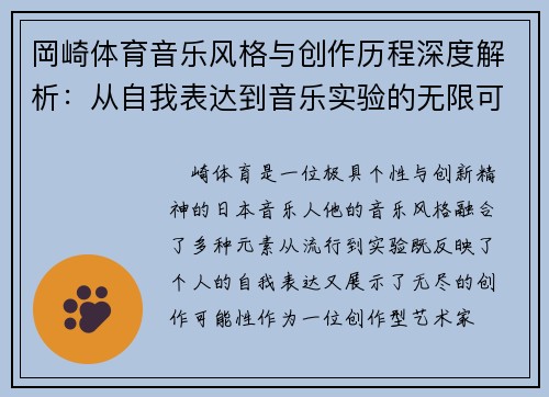 岡崎体育是一位极具个性与创新精神的日本音乐人,他的音乐风格融合了多种元素,从流行到实验,既反映了个人的自我表达,又展示了无尽的创作可能性。作为一位创作型艺术家,岡崎体育的作品不仅仅局限于传统的音乐制作,而是通过不断的尝试和探索,突破了原有的音乐边界,创造出独特的声音世界。通过对其音乐风格与创作历程的分析,我们可以看到岡崎体育如何通过自我表达到音乐实验,探讨个体与社会的关系,传达对现代生活的反思。本篇文章将从四个方面进行深入剖析:自我表达到情感表达、音乐风格的多元融合、歌词的创新与深度,以及不断创新的音乐实验精神,揭示岡崎体育音乐的魅力与无限可能性。
